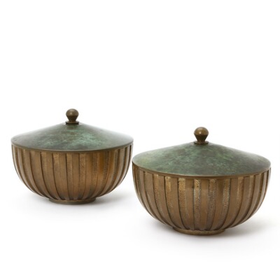 A pair of patinated bronze lidded bowls