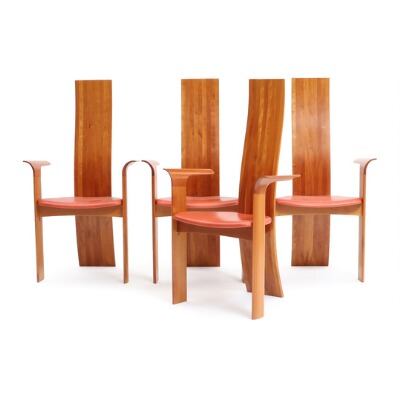 “Iris”. A set of four cherry wood armchairs upholstered in seats with reddish leather.