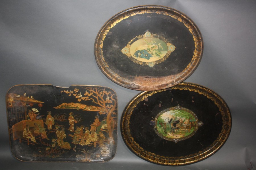 Trois plateaux : Deux en tôle peinte, un en carton bouilli, à décor de scènes chinoises, enfants et fleurs.