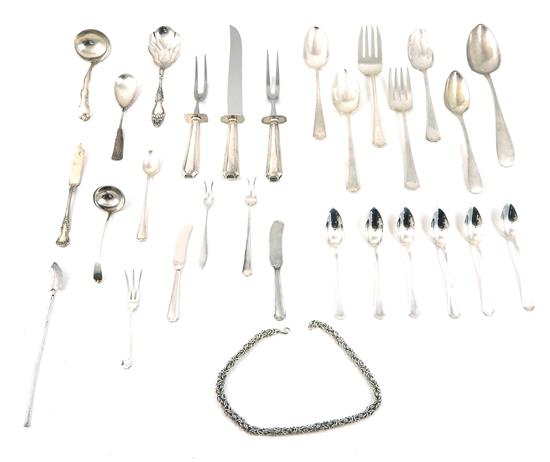 serving pieces and necklace, some weighted: William B. Drugin three-piece salad set, fork, spoon and spork, each with etched scroll design, monogrammed, each approximately 8 3/4" l., 5.99 ozt.; three-piece Gorham carving set with weighted handles, tw