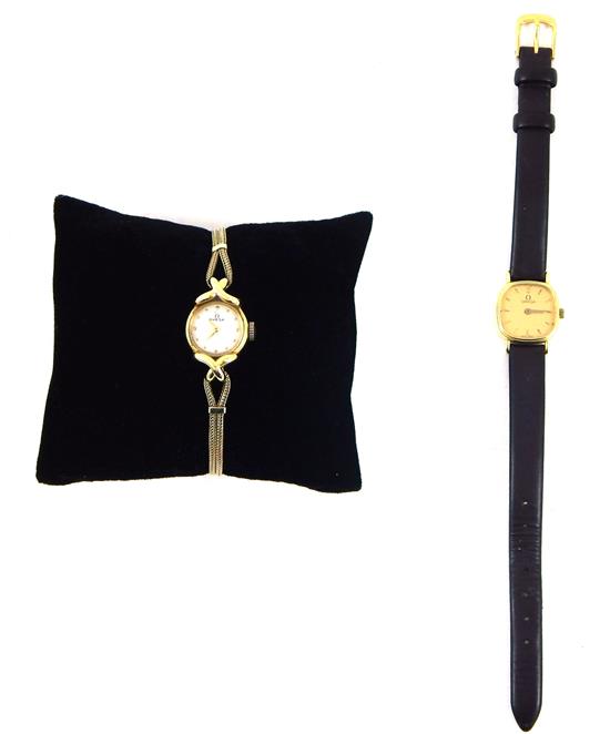 first 18K yellow gold quartz wristwatch, 10 jewels unadjusted, cushion shaped case stamped 18K, brown leather strap with gold plated buckle, back of case with some scratches, watch measures 8 1/8" l. and weighs 13.1 gms including strap; along with Om