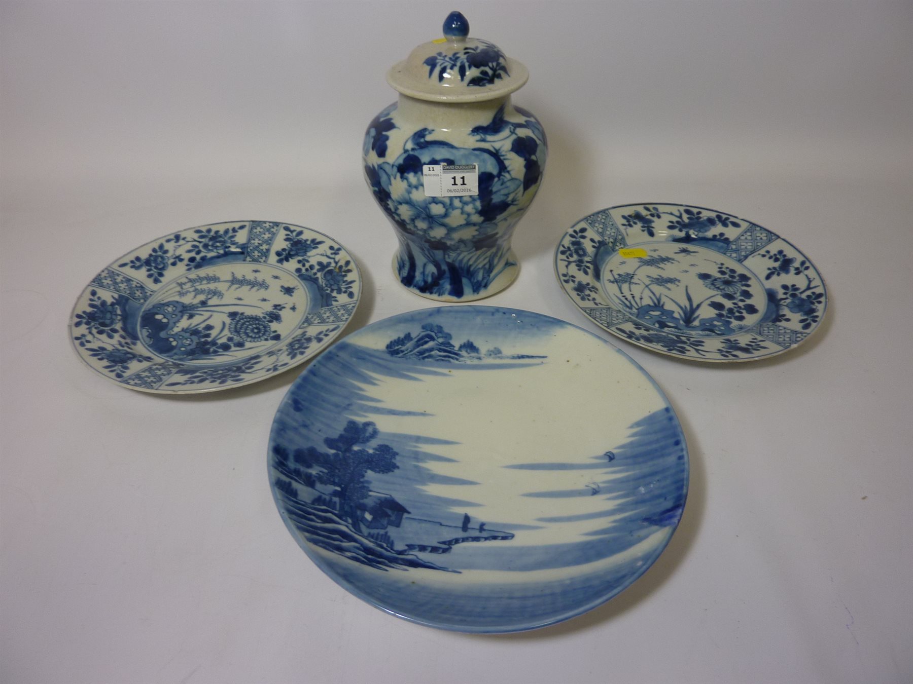 Two 19th century Arita plates, another oriental plate with landscape decoration, and a Chinese blue and white lidded vase with four character kangxi mark H21cm