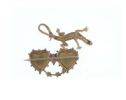 Two brooches. To include an early 20th century 9ct gold 'Mizpah' double heart brooch, together with a sapphire lizard brooch. Lengths 4 to 4.5cms. Weight 7.4gms.