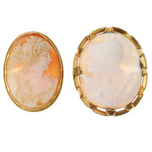 One shell carving depicting Athena and Minerva and a winged torch-bearer, the other depicting a classical figure. Mark indicating gold to second cameo. Lengths 5.3 to 5.9cms. Weight 35.1gms.
