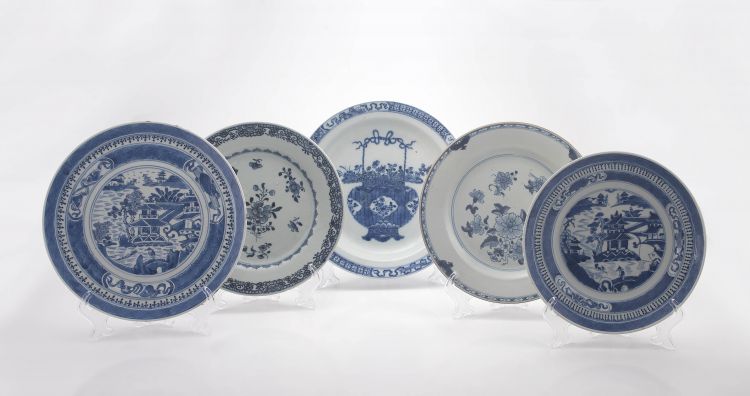 each centre painted with sprays of flowers, the cavetto with double-line and spearhead borders, the rims with diaper and flowerhead bands, hairline cracks, 23,5cm diameter; two Chinese Export blue and white plates, early 19th century, in sizes, each