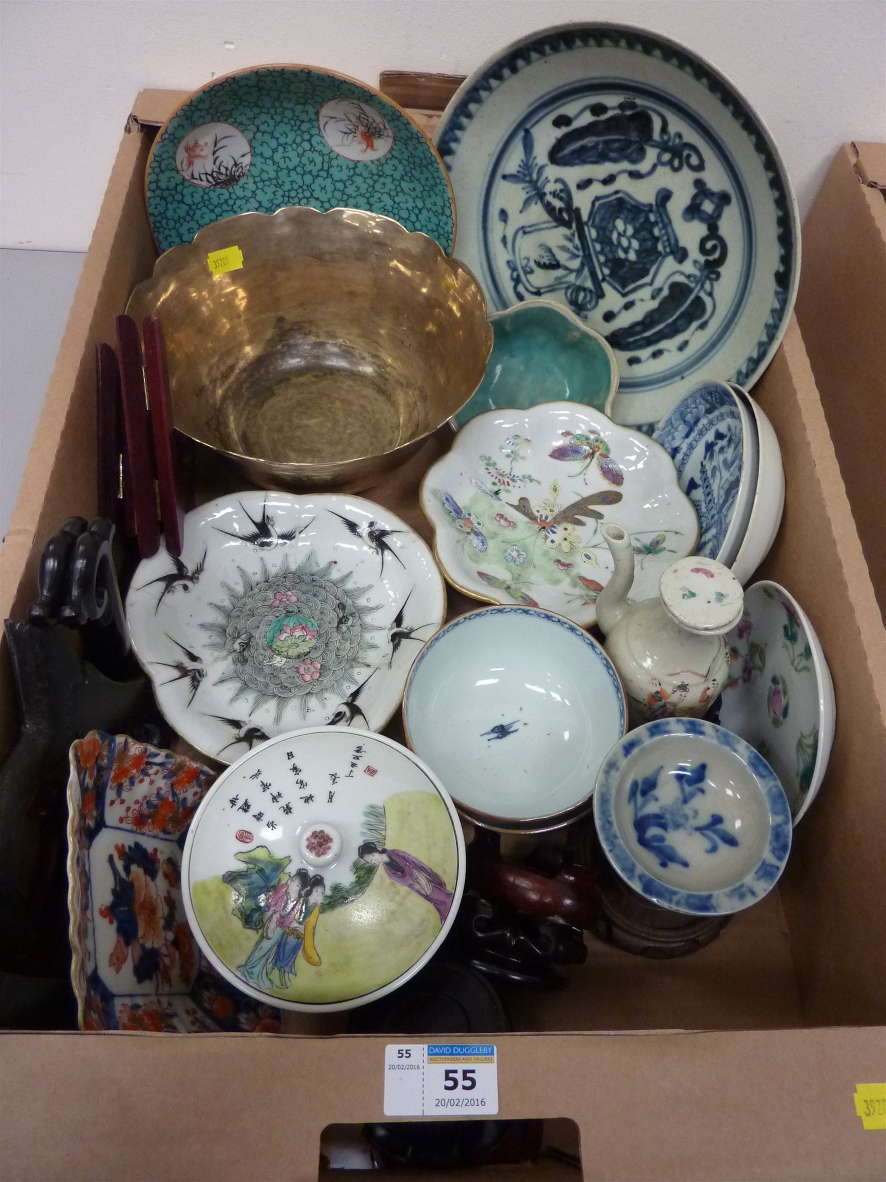 Two Chinese comports decorated with birds and butterflies, other 19th century and later Chinese and oriental decorative ceramics and a Thai silver-plated bowl in one box
