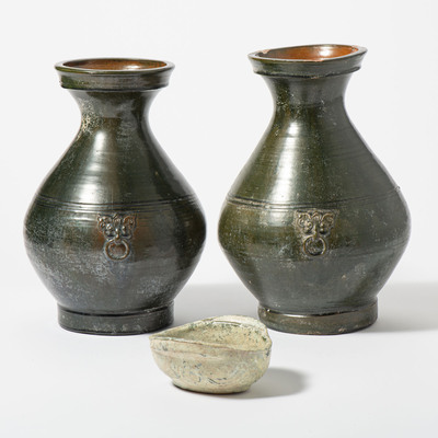 The vases both with flared neck and bulbous body moulded with mask-and-ring handles, the earcup covered with an iridescent green glaze.