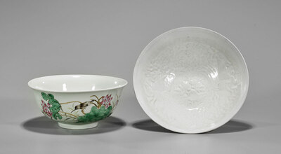 Two Chinese porcelain bowls: Song-style qingbai glazed, showing moulded phoenix and floral designs; together with Famille Rose enameled, exhibiting a bird perch amid flowers and foliage, with inscriptions to side, seal mark to base; D: 7 1/4" (widest