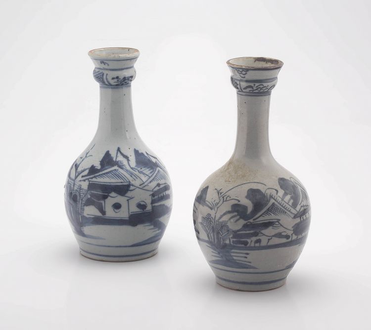 each loosely decorated with boat houses before a mountainscape, with flared rim, the taller 22,5cm high (2)