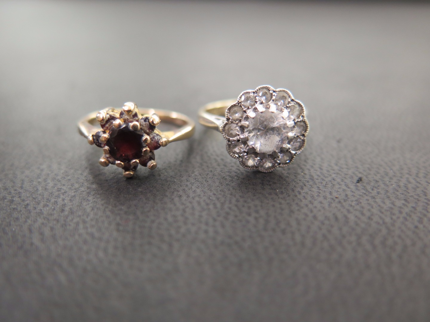 Two cluster rings - To include garnet and white-gem - Both with marks indicating 9ct gold