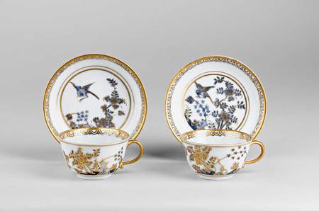 Underglaze blue rock and bird painting with Goldübermalung. Blue swords Meissen, 1740
