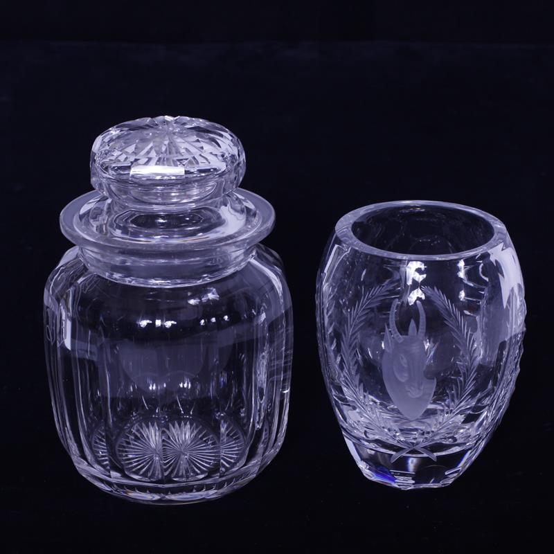 Bohemian Vase with Etched Stag figure. Jar with etched intials.