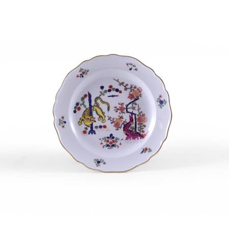 Old yellow lion with Prunusblüten or Indian flowers with birds and insects. Blue swords Meissen 1924-34. Ø 17.5 cm
