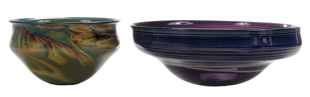 shallow bowl, 1982, purple glass with blue iridescent spiral around sides, engraved near bottom "Dick Huss 1982", 5 x 14 in.; bowl, opaque green and blue with hot-worked decoration in yellow, deep blue, red, and green, engraved near bottom, "Dick Hus