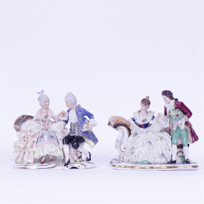 Two Dresden Porcelain Lace Court Couple Figure Groups Both marked Dresden. Gold gilt accents