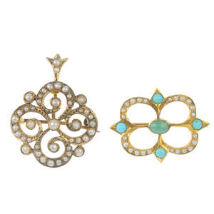 To include a split pearl scrolling foliate pendant, together with a turquoise and split pearl brooch. Pendant may be worn as a brooch. Lengths 3.4 and 2.6cms. Weight 5.9gms.