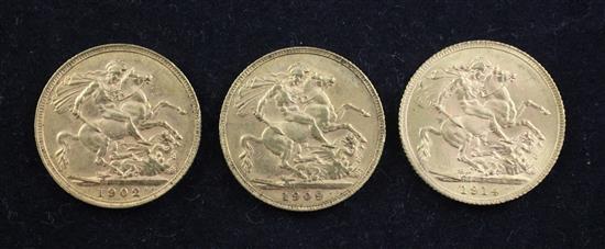 Two Edward VII gold sovereigns, 1902 and 1909, and a George V gold sovereign, 1914, Good VF to EF (3)