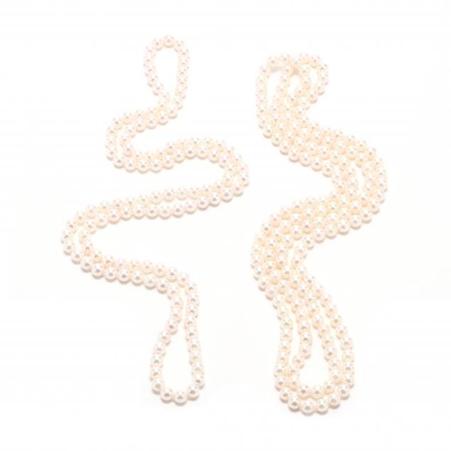 The first strung knotted with (120) round cultured pearls (6.5mm) (32 in.); the second strung knotted with (162) round cultured pearls (6.5mm) (45 in.).