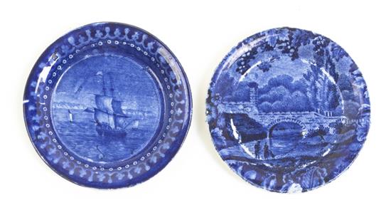 the first depicting a sailing ship, impressed Wood, the second depicting figures by a bridge, impressed with Enoch Wood, Burslem.