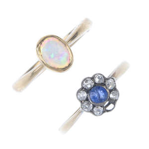 Two gem-set dress rings. To include a mid 20th century 18ct gold sapphire and diamond cluster ring and a 9ct gold synthetic opal single-stone ring. One diamond deficient. Estimated total diamond weight 0.20ct. One with hallmarks for Birmingham, 2008.