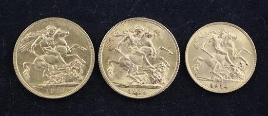 Two George V gold sovereigns, 1912, near EF and 1914, EF and a George V half sovereign, 1914, EF (3)