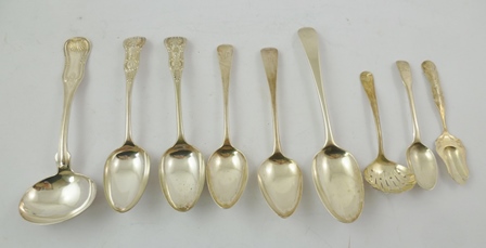 TWO GEORGIAN SILVER DESSERT SPOONS, a rat tail TABLESPOON, a fiddle pattern TEASPOON, mixed assays, 160g. and VARIOUS PLATED FLATWARE