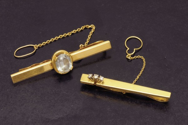 Lot of two clamps tie yellow gold 18 K. One with three bright and one with blue stone aquamarine simile.