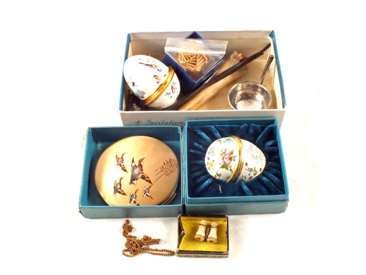 Two Halycon Days enamel eggs, one powder compact and other small items