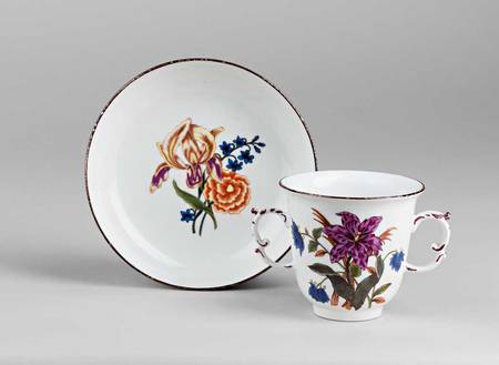 Polychrome painted wooden cut flowers. Brown border lines. Blue swords Meissen, 1740