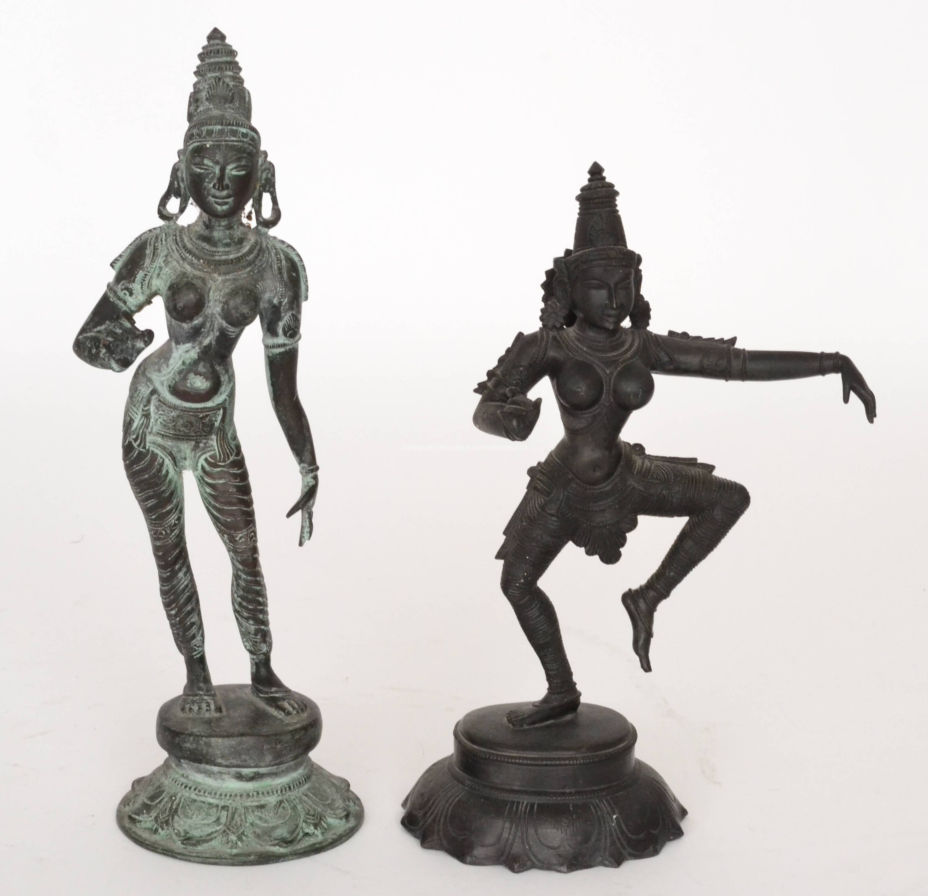 Two Indian Hindu deities, green patinated bronze, height 25cm, together with a bronze effect figure in black patinated finish. (2)