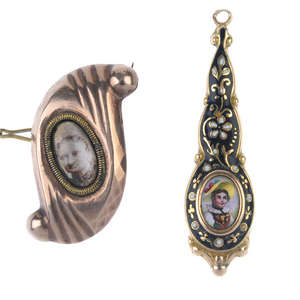 . The first of pear-drop shape and decorated in black and white enamel floral designs to the oval-shape painted portrait panel, the second a curved brooch with central photo panel. Lengths 3.1 to 4.2cms. Weight 7.2gms.