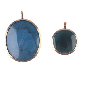 To include a circular-shape photograph pendant with woven hair panel, together with an oval-shape photograph pendant. Lengths 7.7 and 4.8cms. Total weight 40gms.