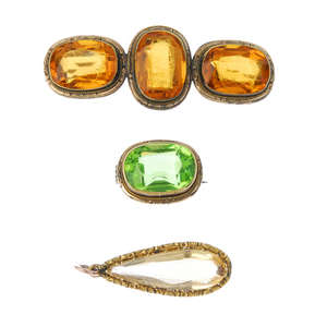 To include a brooch, the oval-shape green paste with rope-twist and foliate surround, together with a pear-shape citrine pendant with floral and foliate mount and a yellow paste three-stone brooch. Lengths 2.3 to 6cms. Weight 29.9gms.