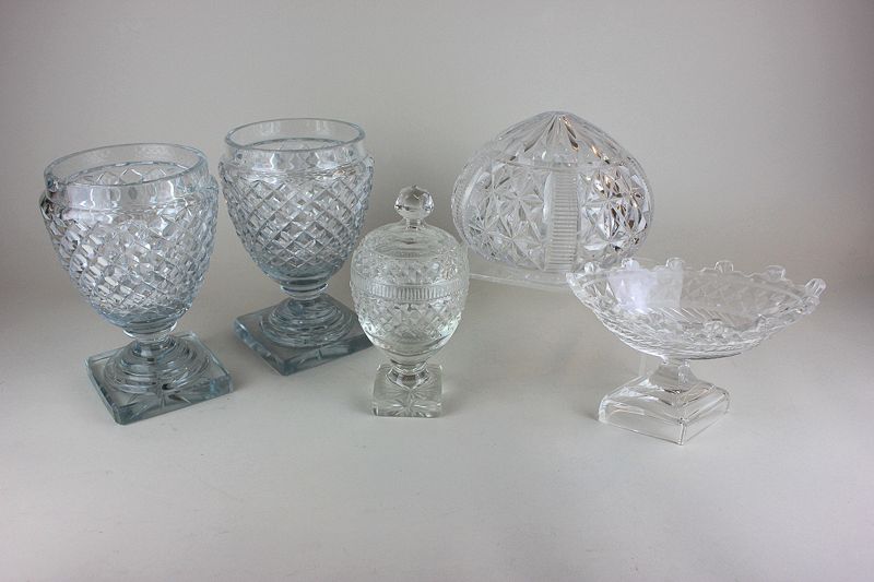 Two lead crystal pedestal pots (missing lids), a smaller jar and cover, a dish and a cut glass lampshade