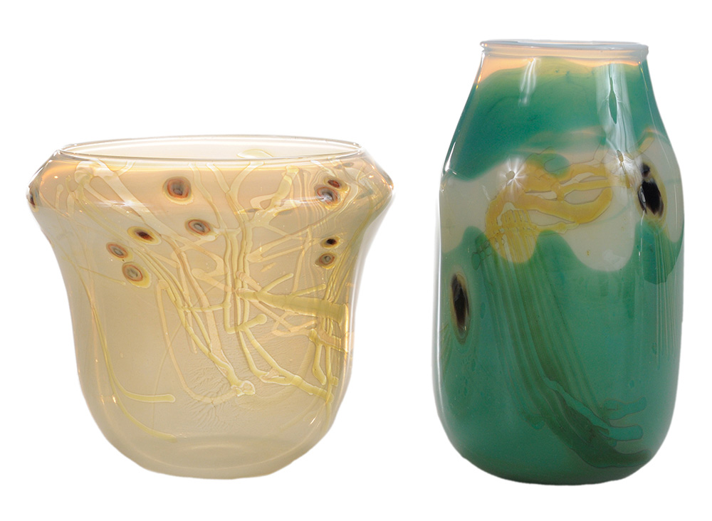 free-blown pale aqua vase with off-white and pale yellow abstract flowers on medium green ground, engraved signature near bottom "Robert William Bartlett 75-193", 8 in.; vase, 1976, creamy pale aqua glass swelling slightly outward from the base to a