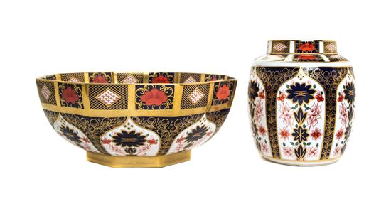 comprising a center bowl and a ginger jar, each in the Imari pattern.