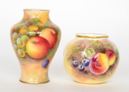 Two Royal Worcester fruit painted vases, the first of ovoid wrythen form panel decorated by Delaney with hand painted peaches and cherries, black printed mark with date code for 1953, the second of high shouldered form panel decorated by Shuck with a