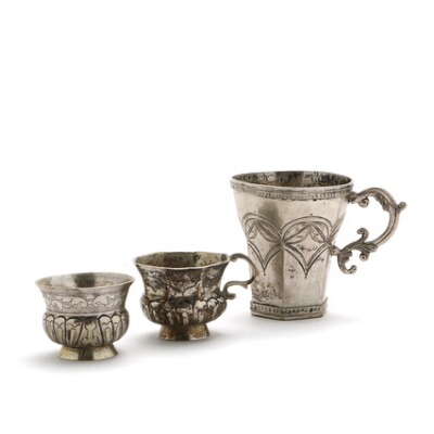 Two Russian Rococo silver vodka cups and A Russian silver tea cup