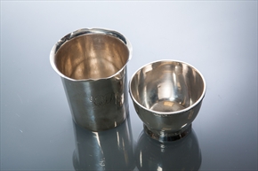 one with maker's mark 'W.M', Edinburgh 1892, engraved with initials 'CJD', 7.5cm high; the other beaker maker S Blanckensee & Sons Ltd, Birmingham 1932, with repeating border to rim and foot, 5cm high, approximately 139g gross (2)