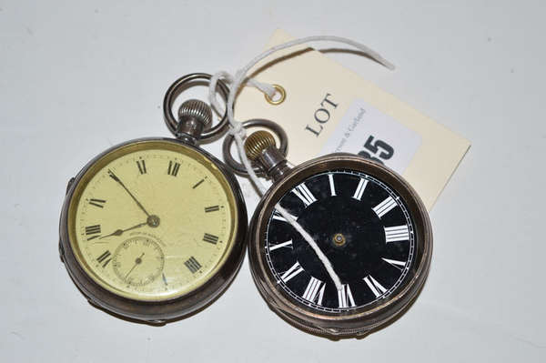 Two silver cased open faced pocket watches, one with white enamel roman dial and subsidiary seconds aperture; the other with black enamel roman dial (missing glass and hands).