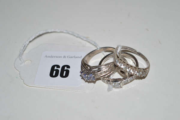 Two silver rings set with blue and white stones; a white stone set 9ct. white gold ring; and a diamond set silver pendant.