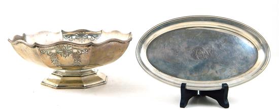 presentation bowl, scalloped and pierced rim with scroll and garland motif, raised on octagonal pedestal base, marked on base, 4" h. x 9 3/4" w.", 19.86 ozt.; along with a small oval tray, monogrammed, marked on base, 9" w., 4.66 ozt.; both pieces wi