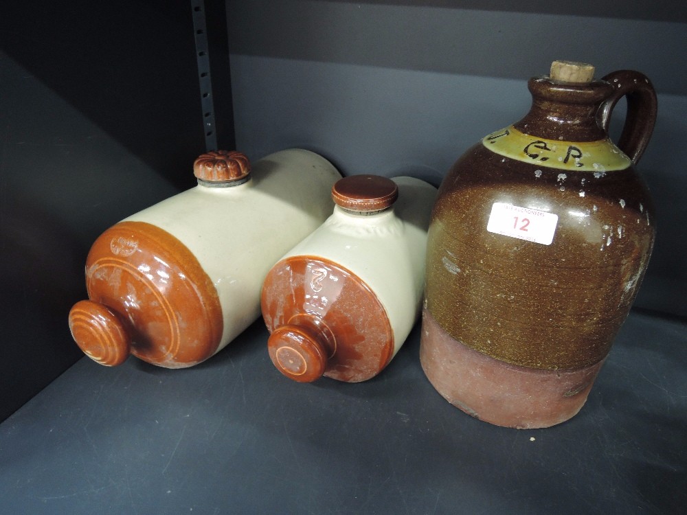 Two stoneware hot water bottles and a stoneware bottle JJ. G.P