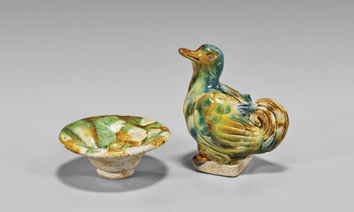 Two Chinese Tang Dynasty sancai glazed pottery pieces: standing duck, finely modeled and incised, showing blue glaze; together with round vessel or cover with knop to interior; H: 3 1/2" (duck)