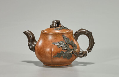 Unusual Chinese Yixing pottery teapot; of lobed-form, with moulded branch-motif finial, spout, and handle, bearing fruit and foliage; marker's mark to base; L: 7 1/2" (approx.)