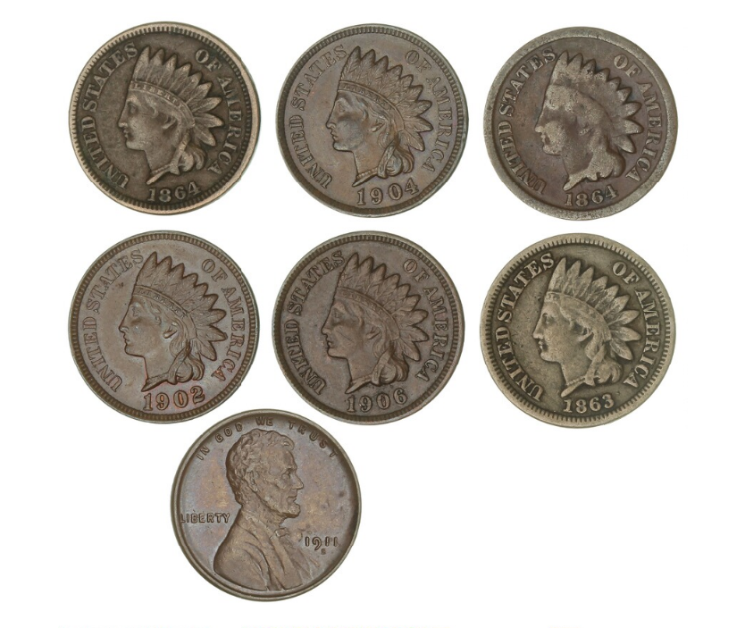USA, collection of 1 cent-coins, incl. 1863, 1864, KM 90, 1864, 1902, 1904, 1906 KM 90a and 1911 S, KM 132, in total 7 pcs