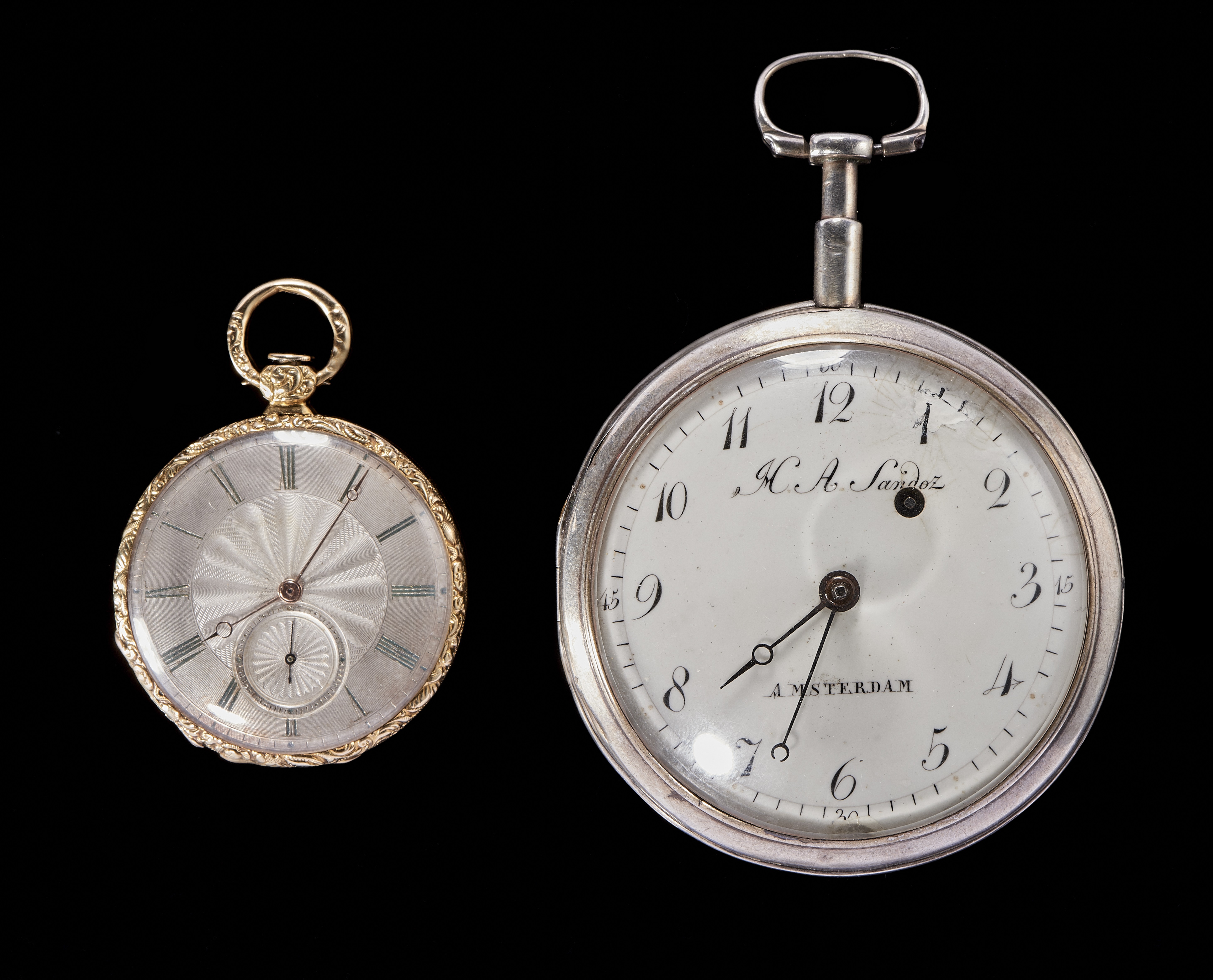 Gray guilloche dial, golden hands, light blue Roman numerals, seconds at 6 o'clock, 750 gold, approx. 36 mm, gross weight 30 g, with Vacheron Constantin letter indicating a date of manufacture in 1835. A HASandoz pocket watch is added to Amsterdam, w