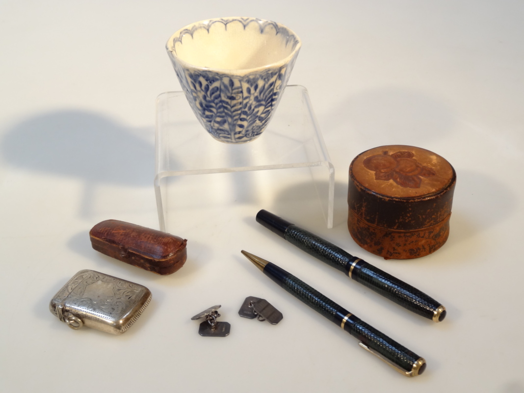 comprising a Wyvern fountain pen with 14k nib and similar ball point pen in textured crocodile style leather in green and blue, a Japanese blue and white transfer printed tea bowl with six character mark beneath, 6cm high, a silver plated vesta case,