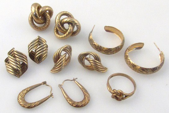 comprising five pairs of earrings, to include an entwined set and a similar dress ring, size M, yellow metal some pieces marked 375, 6.5g net. (a quantity)