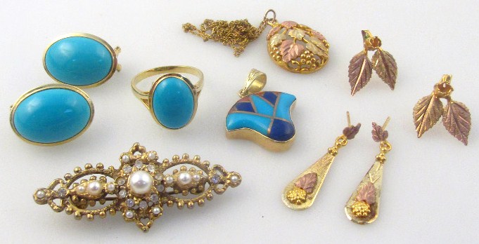 comprising a turquoise style set comprising earrings and ring, size M, costume bar brooch, a jewellery set comprising club earrings and matching pendent on slender link necklace with leaf design, some pieces indistinctly marked. (a quantity)
